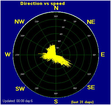 Maximum windspeed = 9.2 mph from 338°(NNW) on day 05 at time 13:36