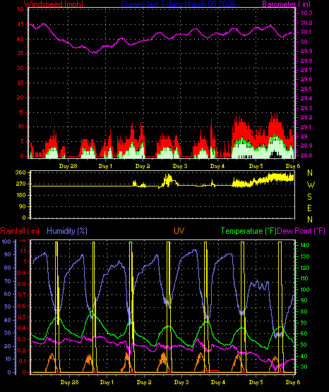 Maximum gust speed = 15.0 mph from 338°(NNW) on day 05 at time 13:36